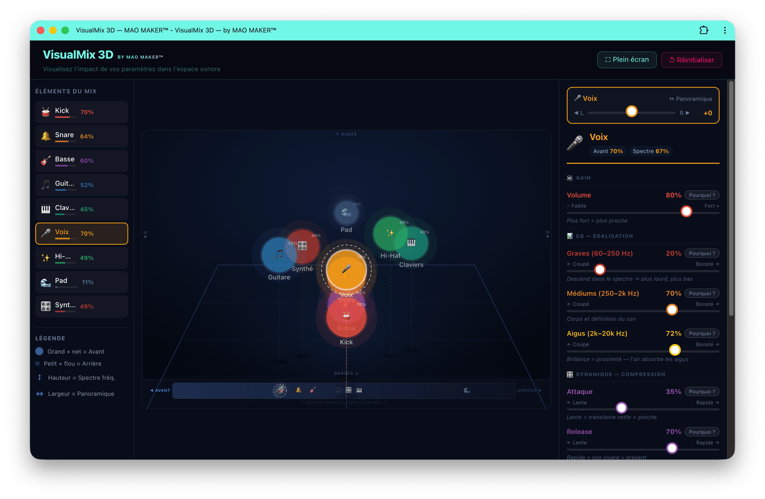 VisualMix 3D™️ est une app pédagogique qui t’aide à comprendre visuellement le mixage, en montrant comment différents réglages influencent la largeur, la profondeur et la présence de tes éléments dans l’espace.