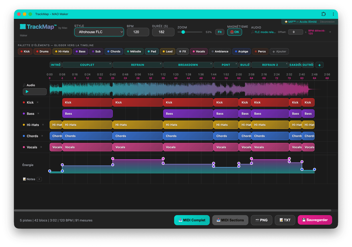 Trackmap™️ te permet de décortiquer tes références, vérifier l’évolution de l’énergie dans tes morceaux et construire des arrangements plus solides, avec une vraie direction.